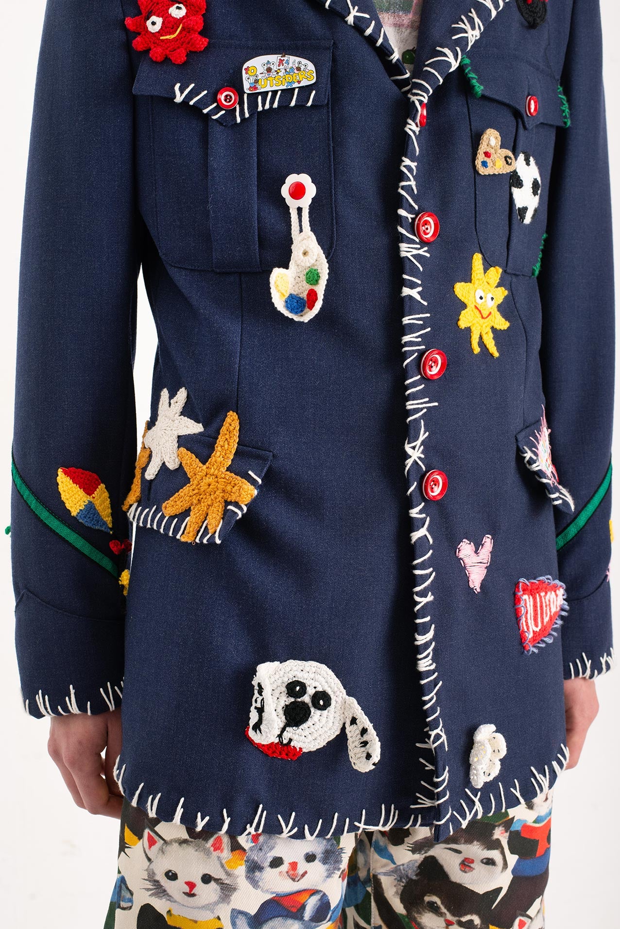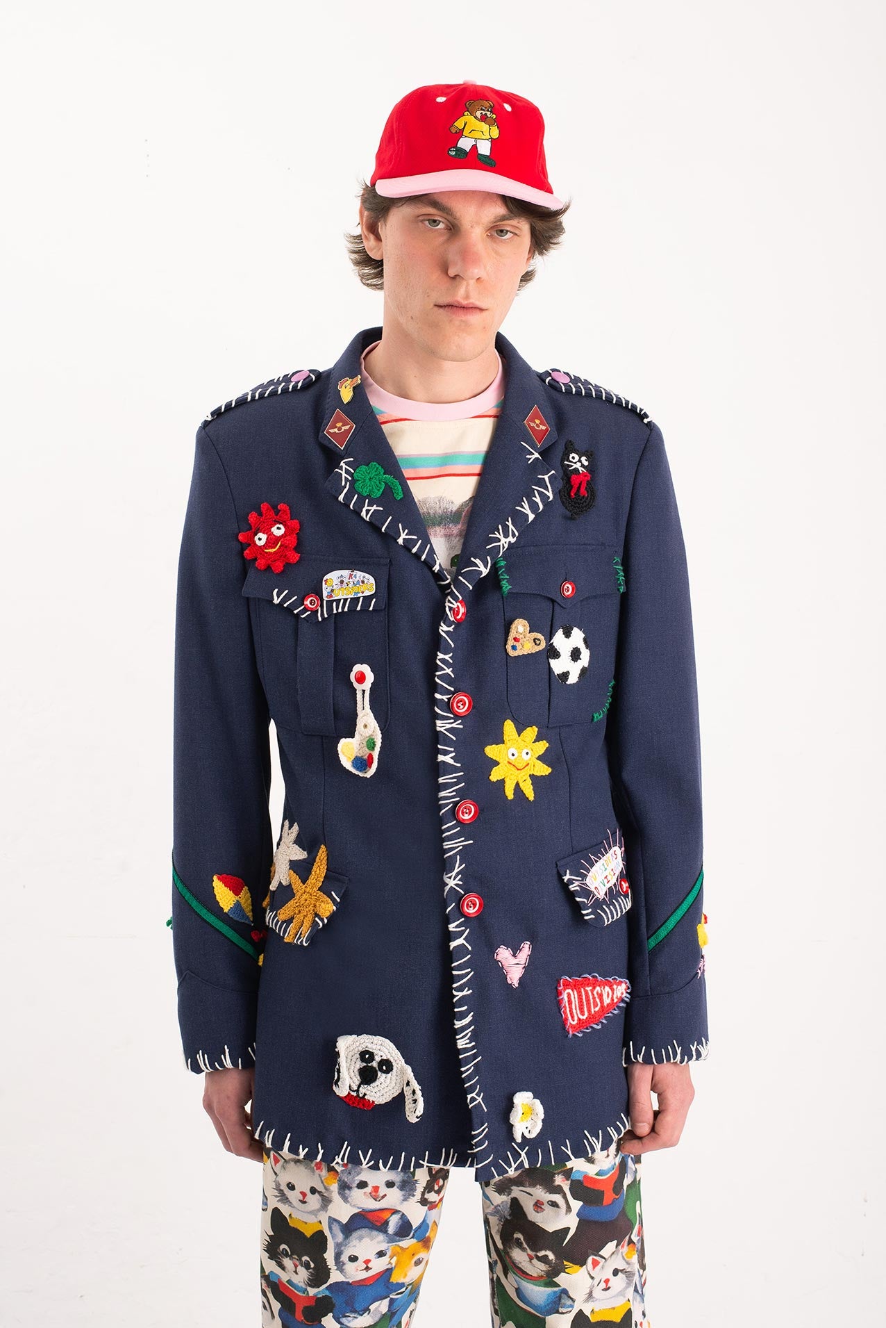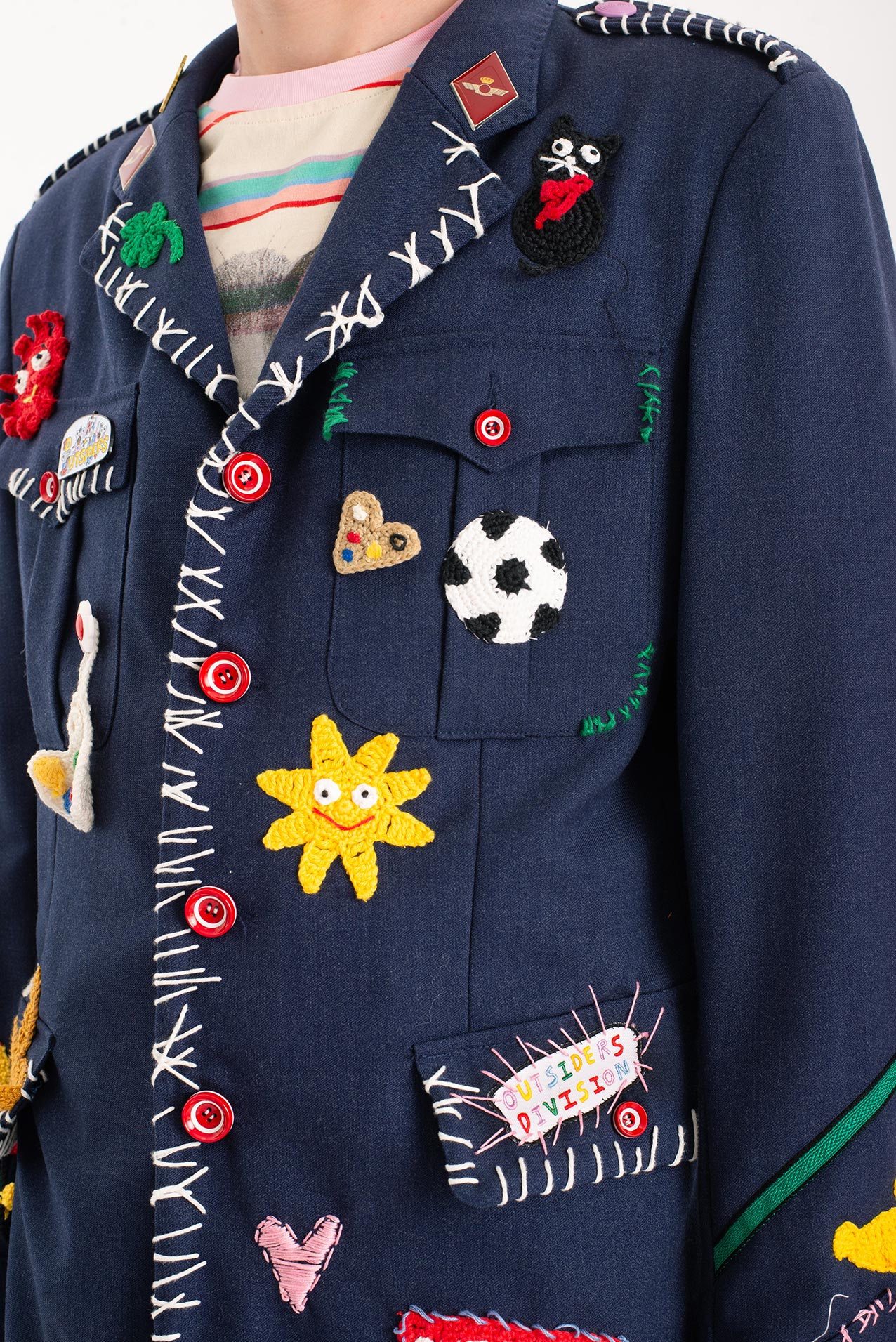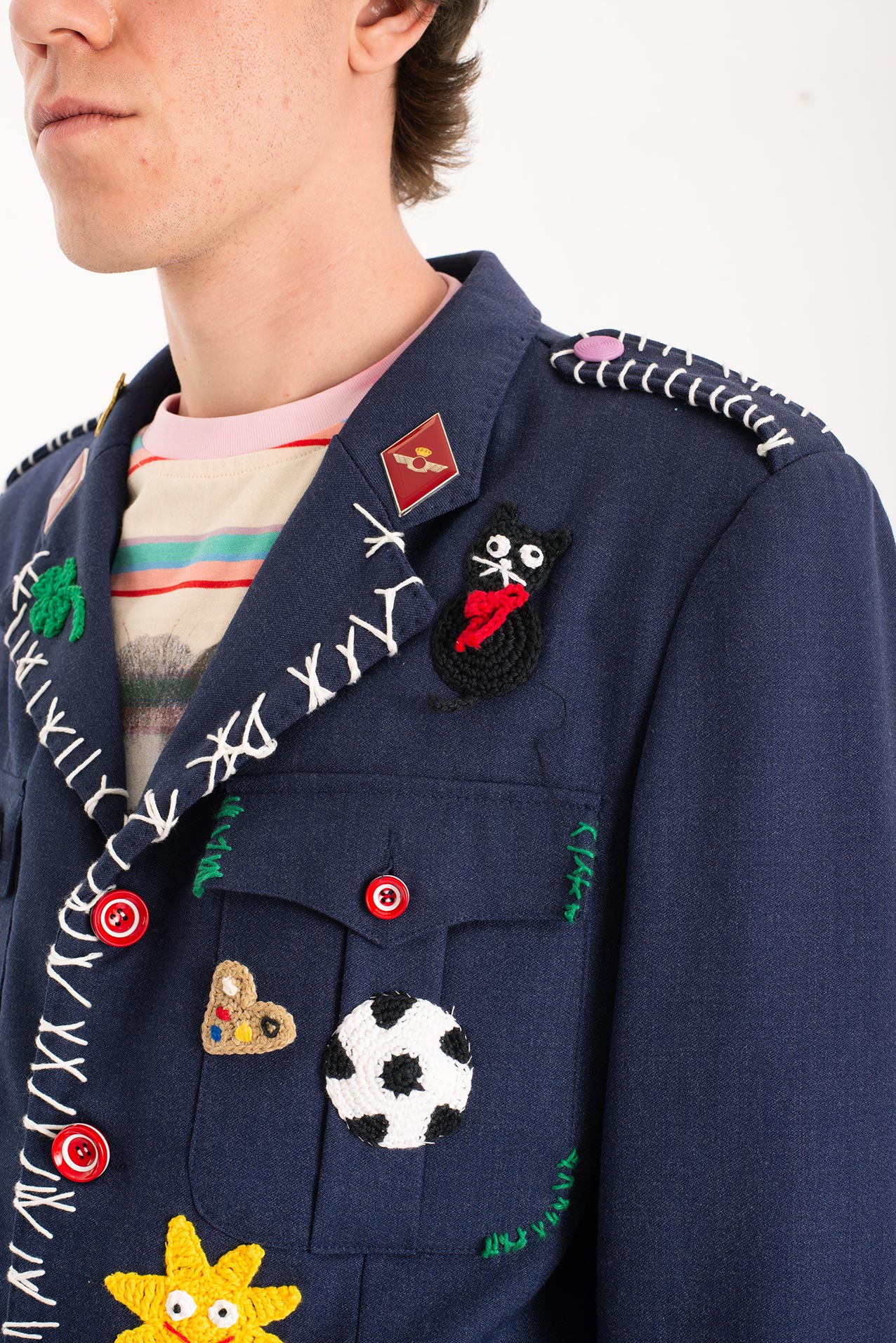 Forget discipline. This general shows up late, covered in crochet, and smelling faintly of bubblegum. Once a military jacket, now a battlefield of embroidery, appliqués and pins screaming: “Yes, we love uniforms, but only if they’re ridiculous.” Wear it and you might accidentally start a parade instead of a war.
