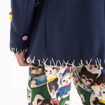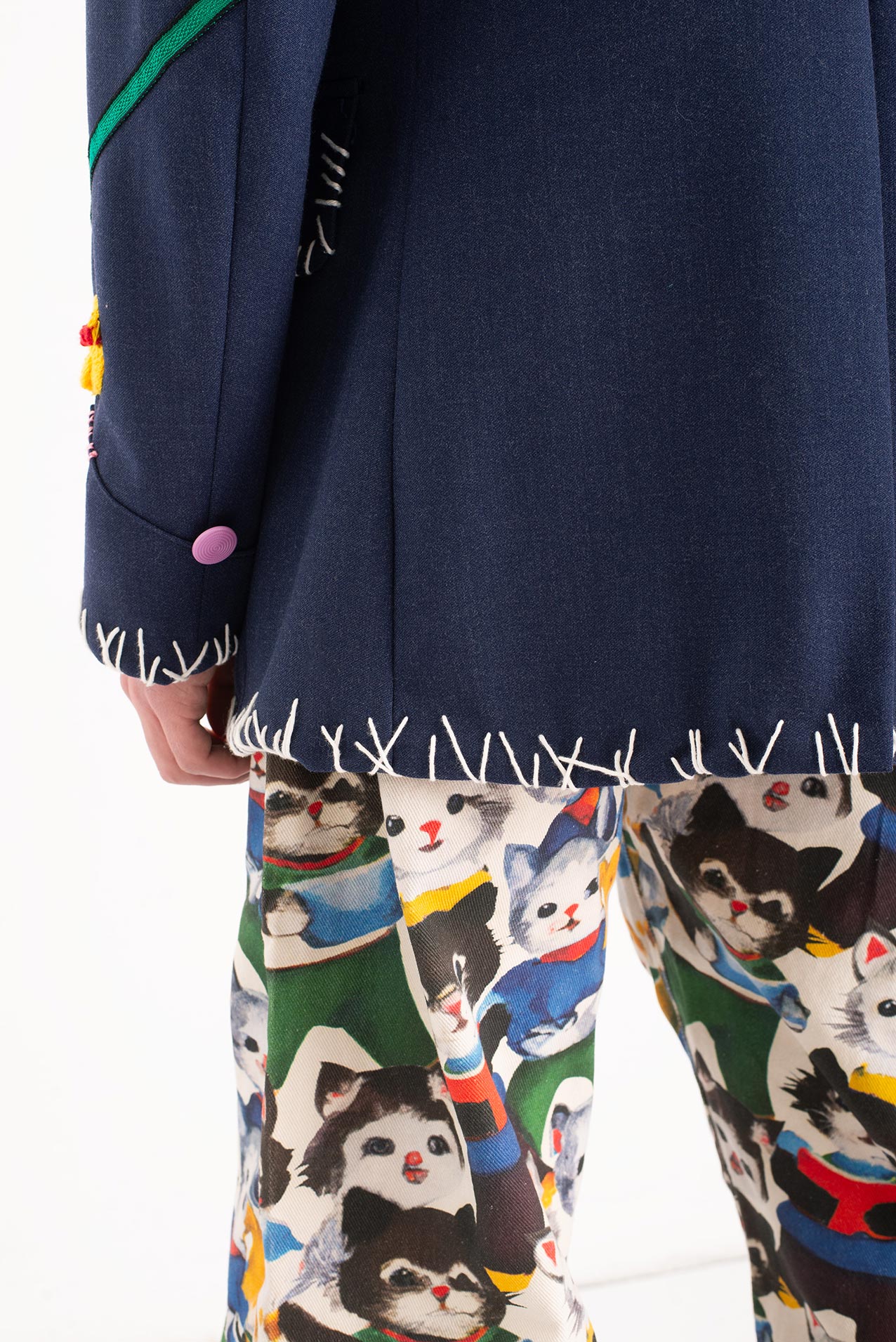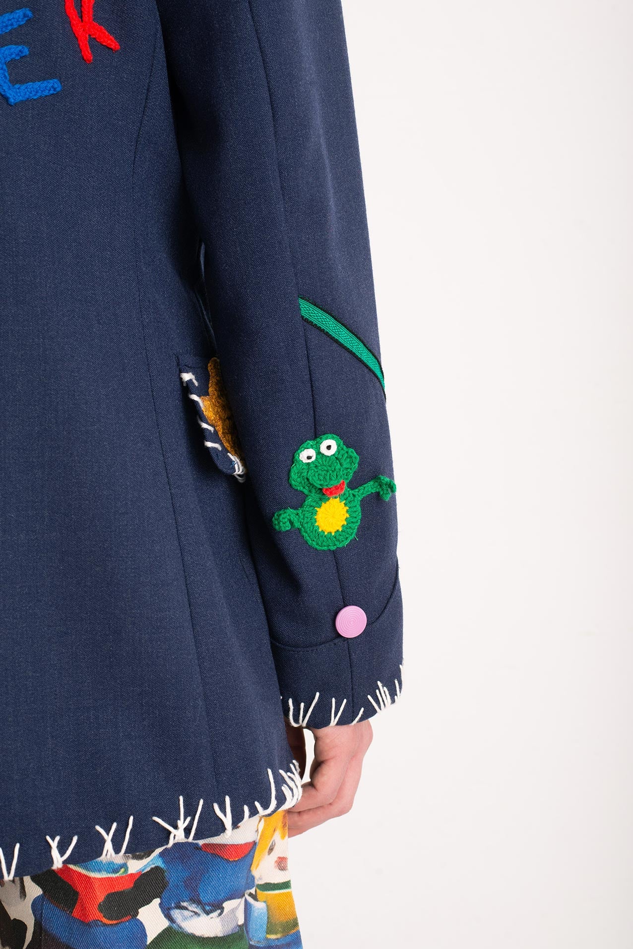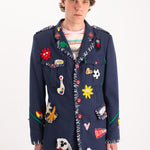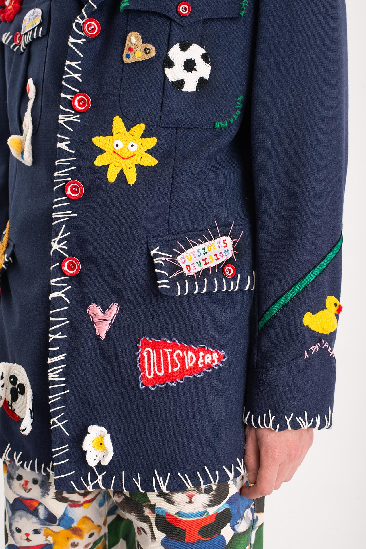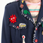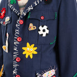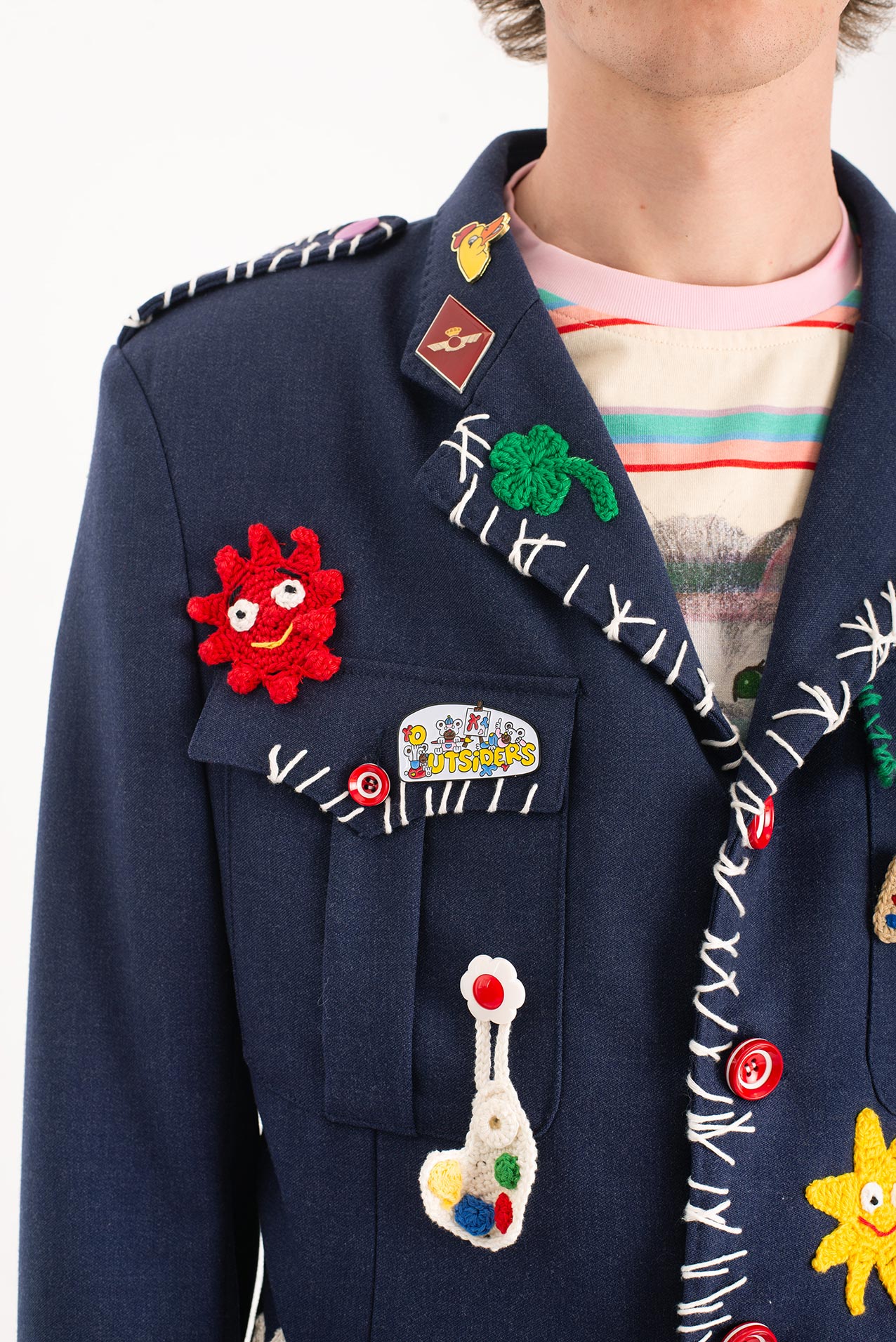 Forget discipline. This general shows up late, covered in crochet, and smelling faintly of bubblegum. Once a military jacket, now a battlefield of embroidery, appliqués and pins screaming: “Yes, we love uniforms, but only if they’re ridiculous.” Wear it and you might accidentally start a parade instead of a war.