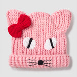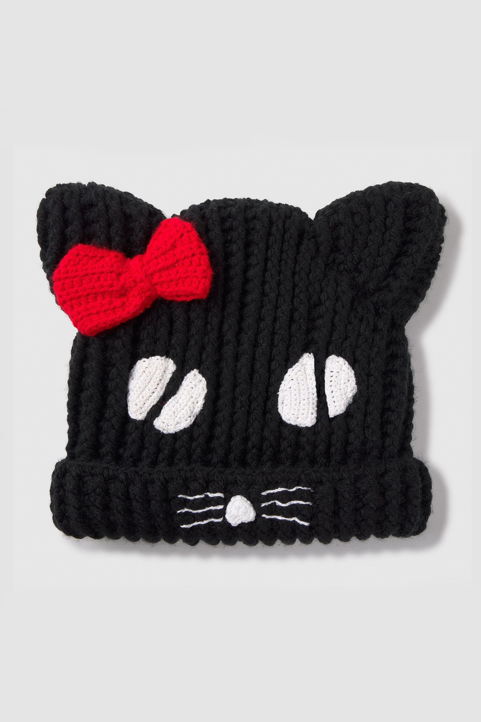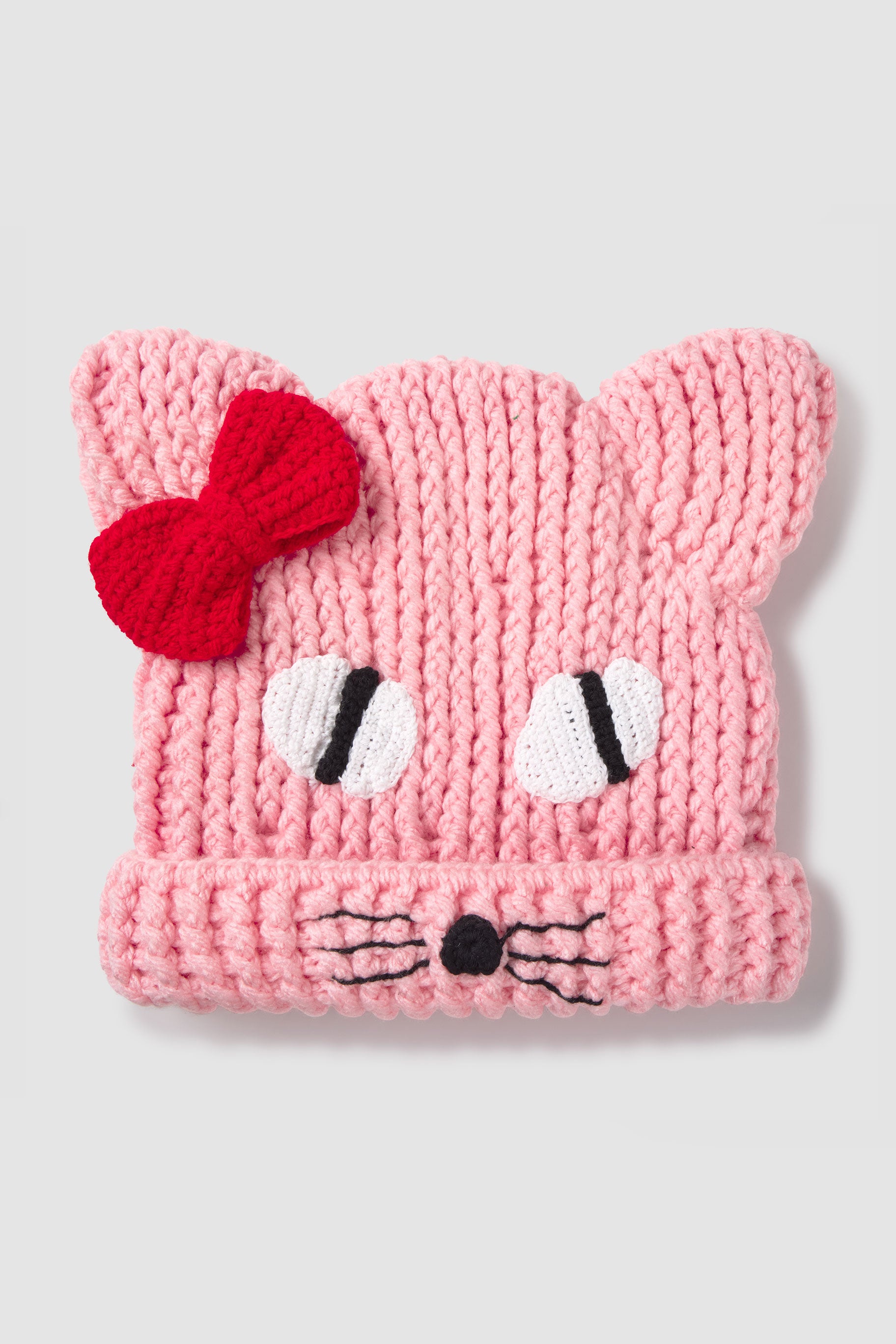 A handmade knit beanie featuring a graphic cat face and bow detail. The thick yarn construction creates volume and structure, making it both functional and visually distinctive. Designed to add a playful yet considered touch to everyday looks.