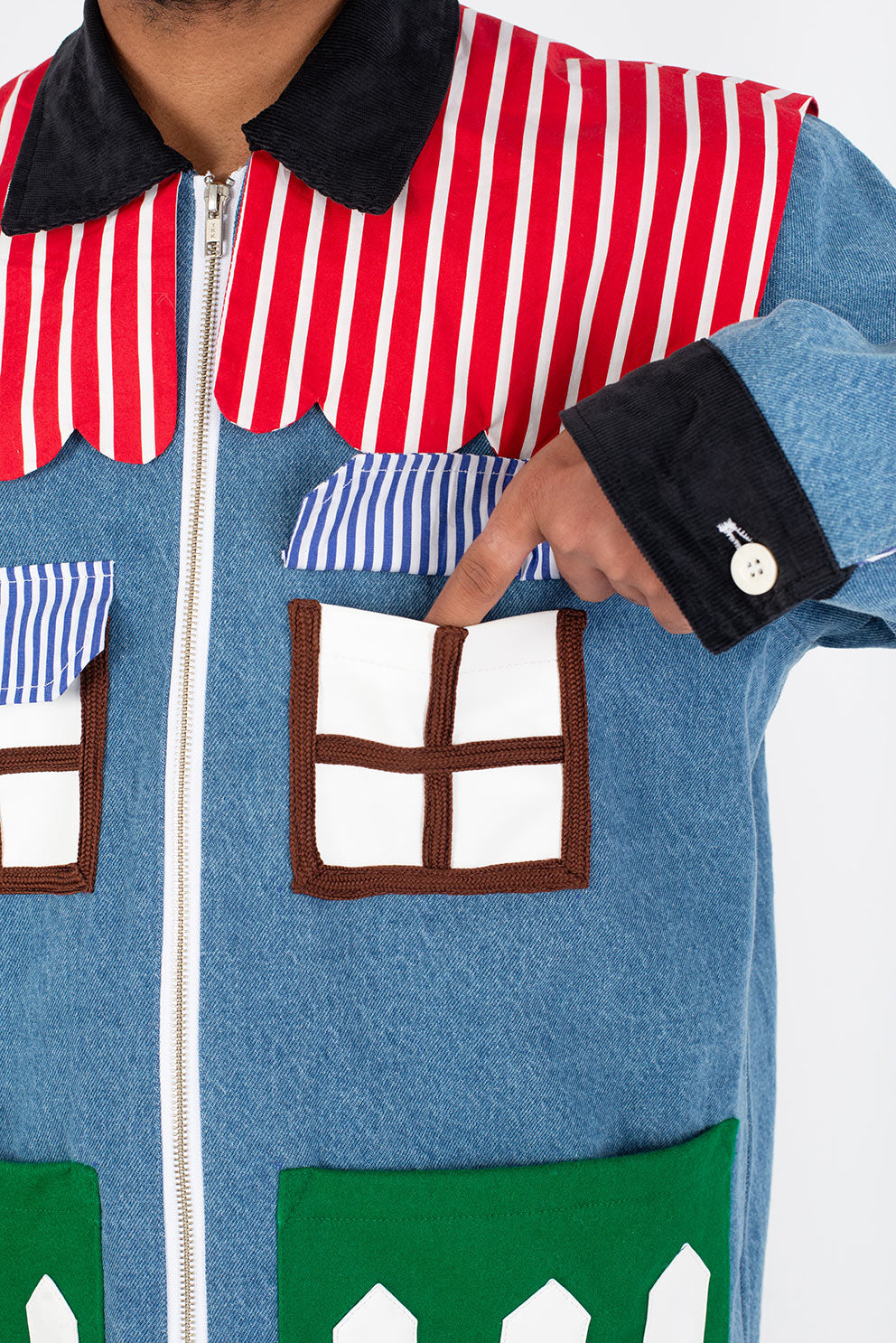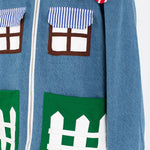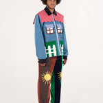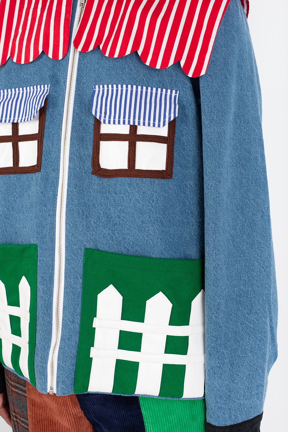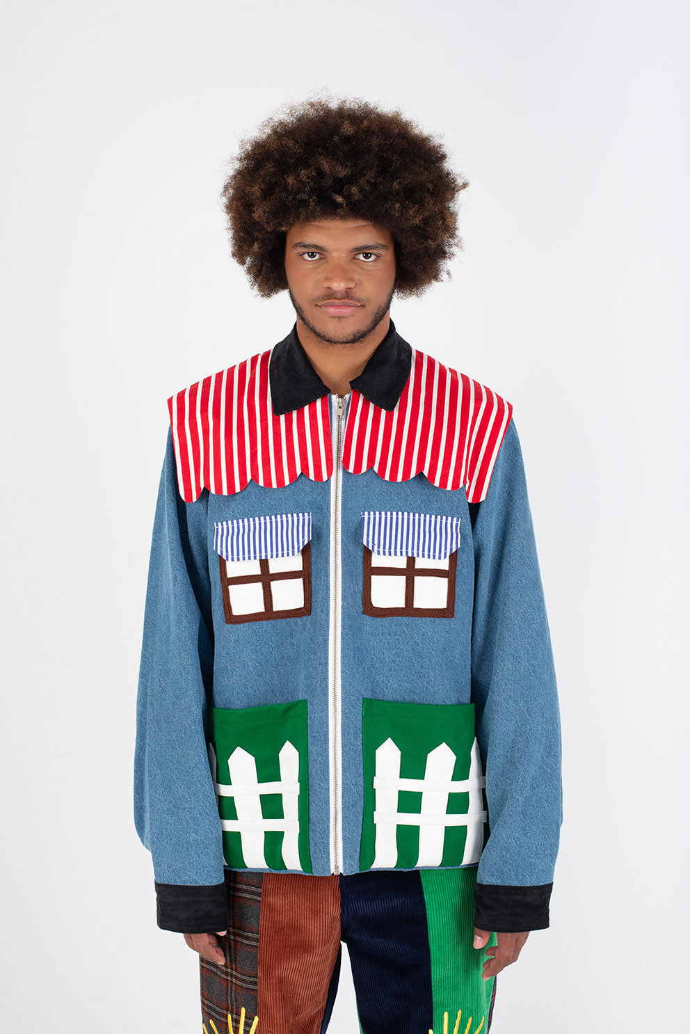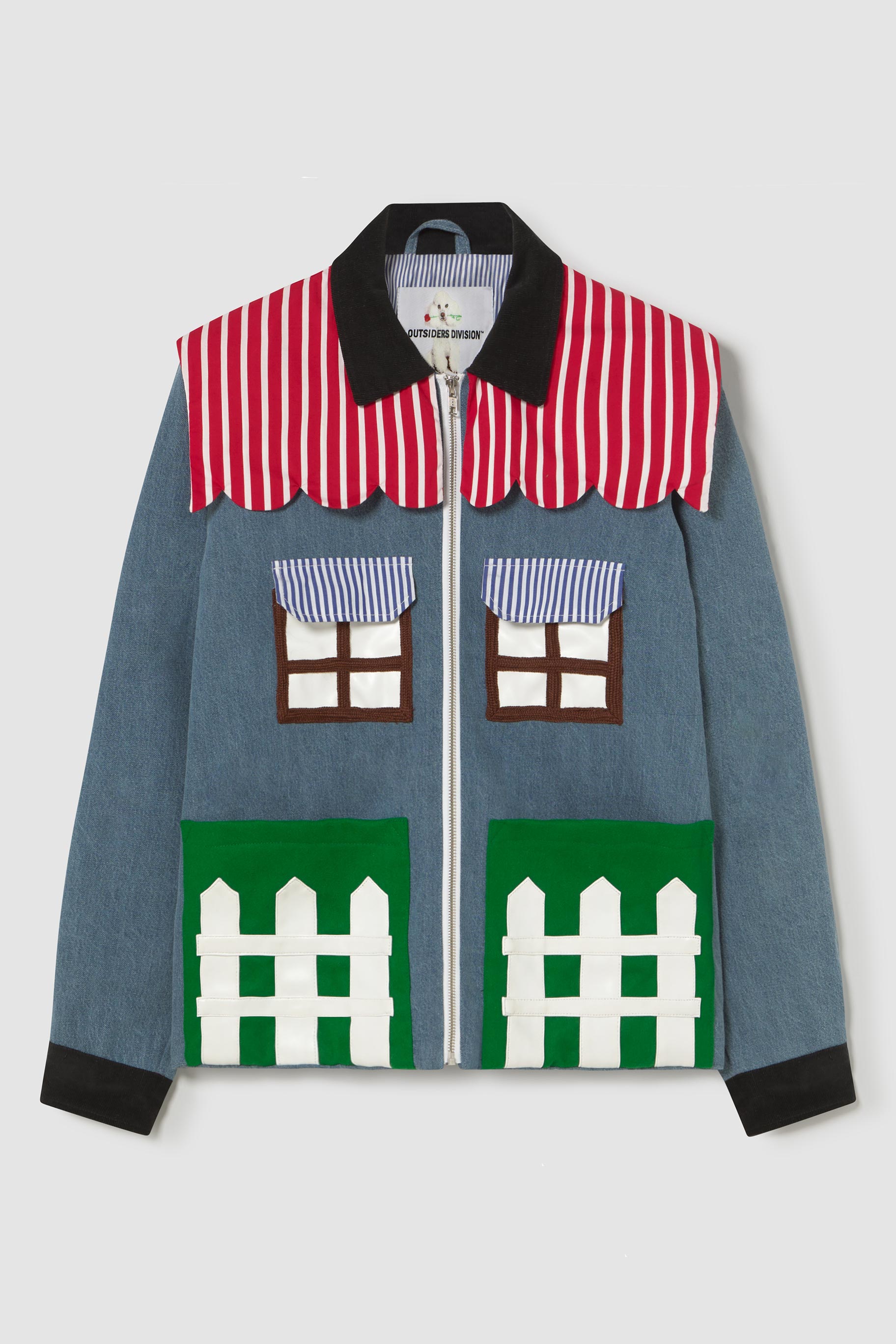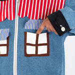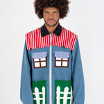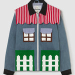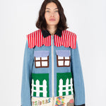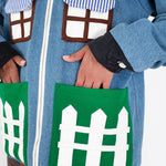 Welcome home. Literally. This jacket thinks it’s a house and refuses therapy. With windows that double as pockets (because storage is architectural), bushy green shrubs blooming along the sides, and a polite little fence guarding your torso, it’s suburban real estate you can wear. Put it on and suddenly you’re mortgage-free, property-rich, and disturbingly cozy.