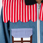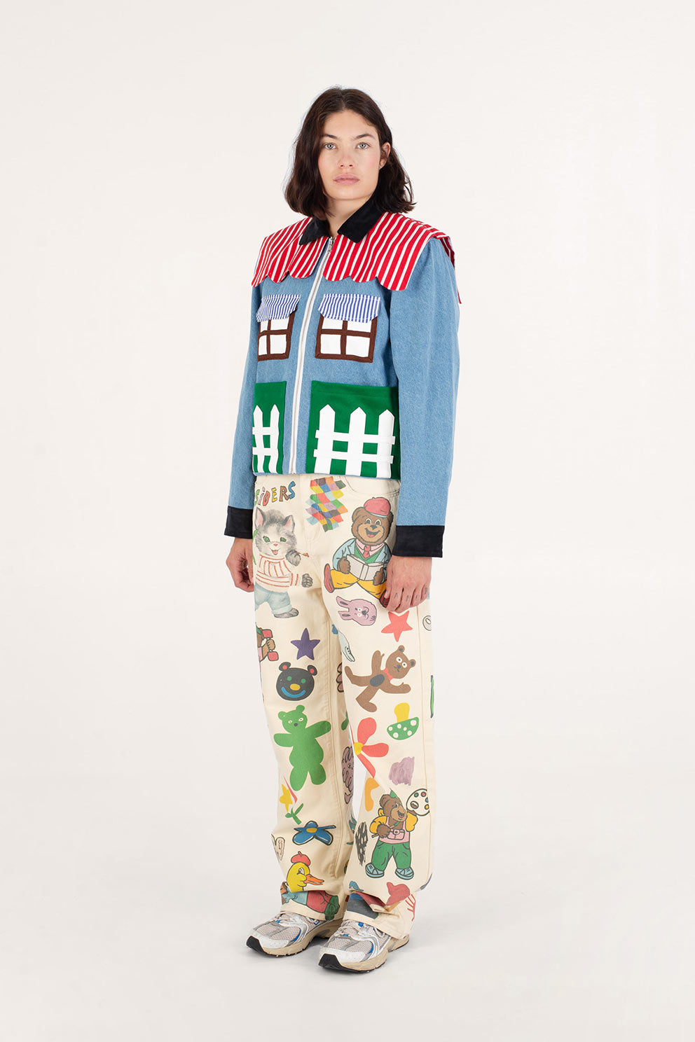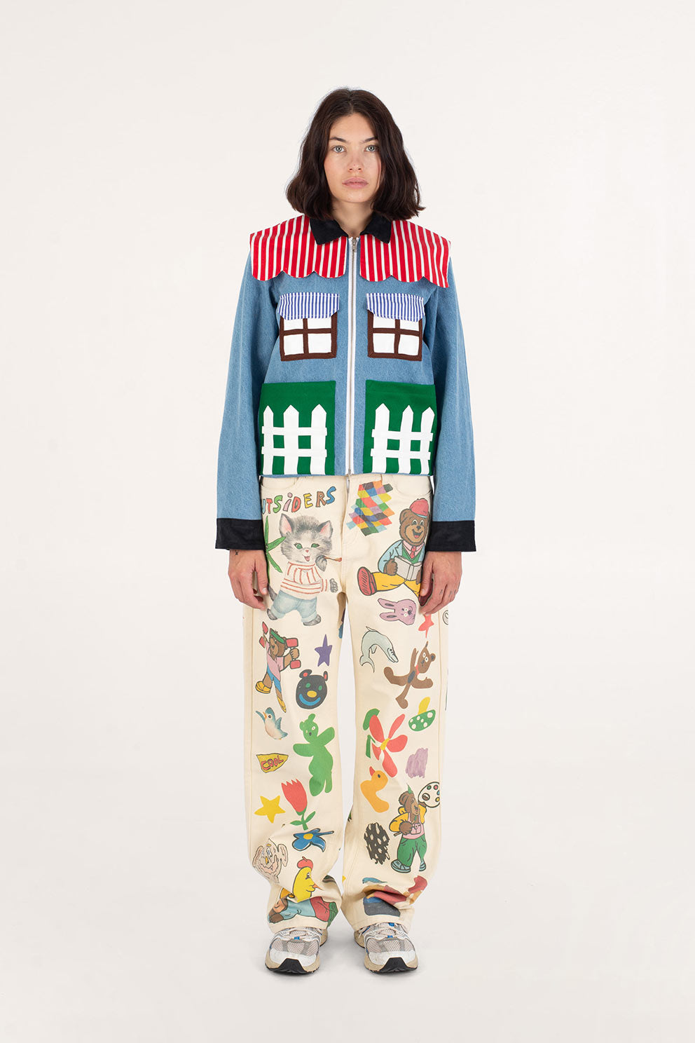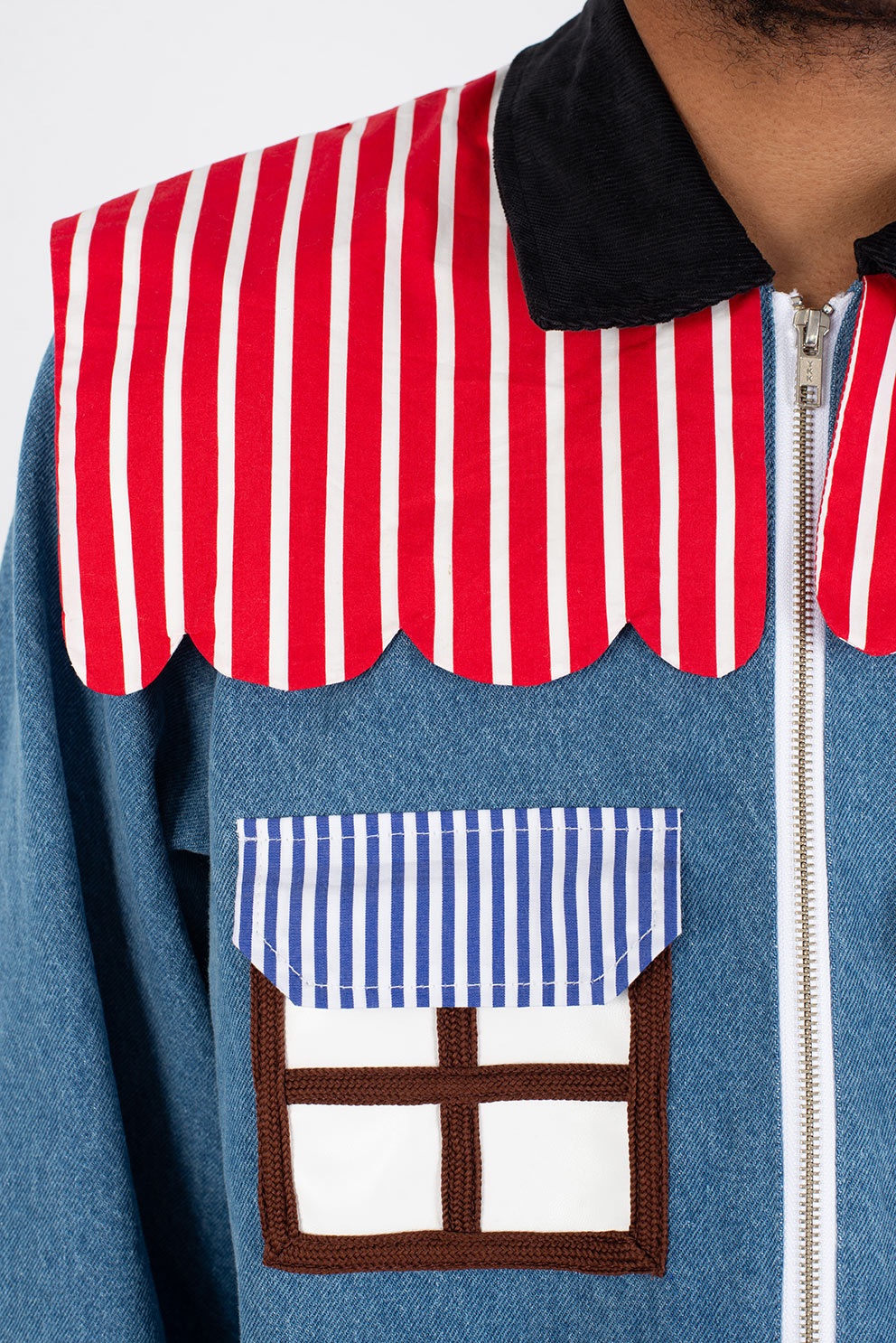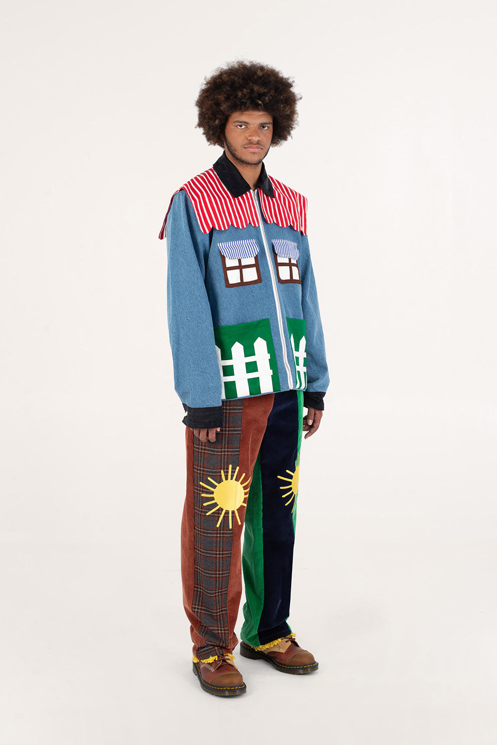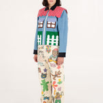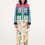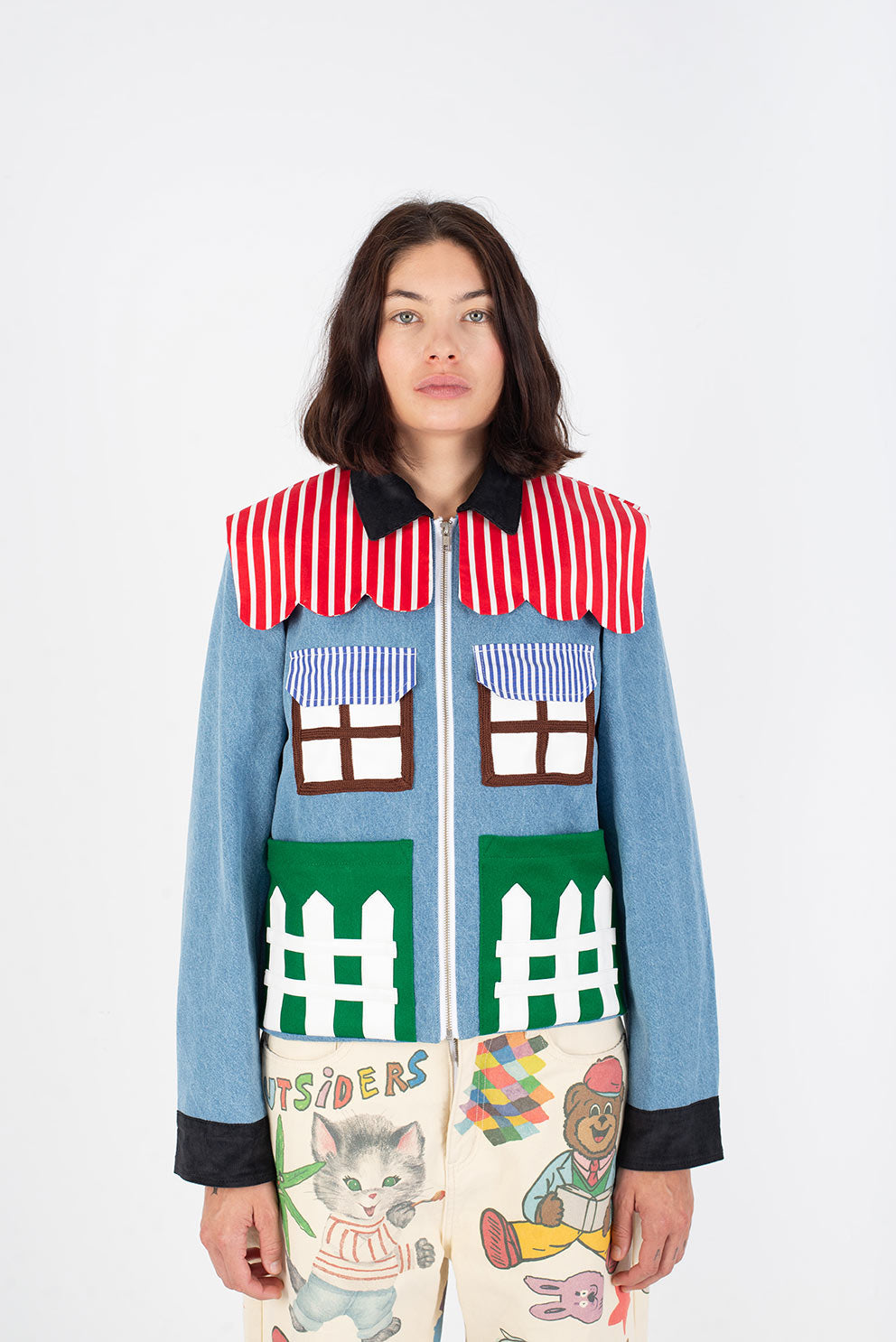Welcome home. Literally. This jacket thinks it’s a house and refuses therapy. With windows that double as pockets (because storage is architectural), bushy green shrubs blooming along the sides, and a polite little fence guarding your torso, it’s suburban real estate you can wear. Put it on and suddenly you’re mortgage-free, property-rich, and disturbingly cozy.